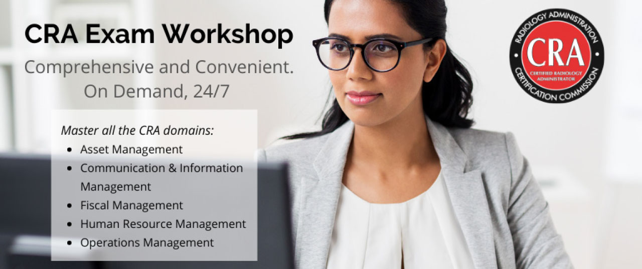 The Certified Radiology Administrator (CRA) designation is the gold standard for medical imaging leaders. This certification validates key skills, knowledge, and competencies required and expected of leaders in medical imaging and demonstrates a commitment to quality and value. For those interested in preparing for the CRA exam, AHRA: The Association for Medical Imaging Management, offers the CRA Exam Workshop. This course is available online and on demand to prepare for the CRA exam anywhere, anytime. It helps identify areas of strength and opportunities for improvement. Watch the videos all at once or a little bit at a time and replay as often as you like.