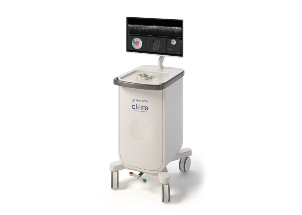 Claire combines Perimeter’s proprietary AI with its patented wide-field OCT imaging to enable high-resolution, real-time evaluation of excised tumor margins. The system delivers 10 times higher resolution than standard X-ray and ultrasound at 2mm imaging depth – the clinically relevant margin width for breast cancer margin assessment. Claire’s innovative AI technology was trained on Perimeter’s proprietary and growing OCT image library of over 2 million breast tissue images.