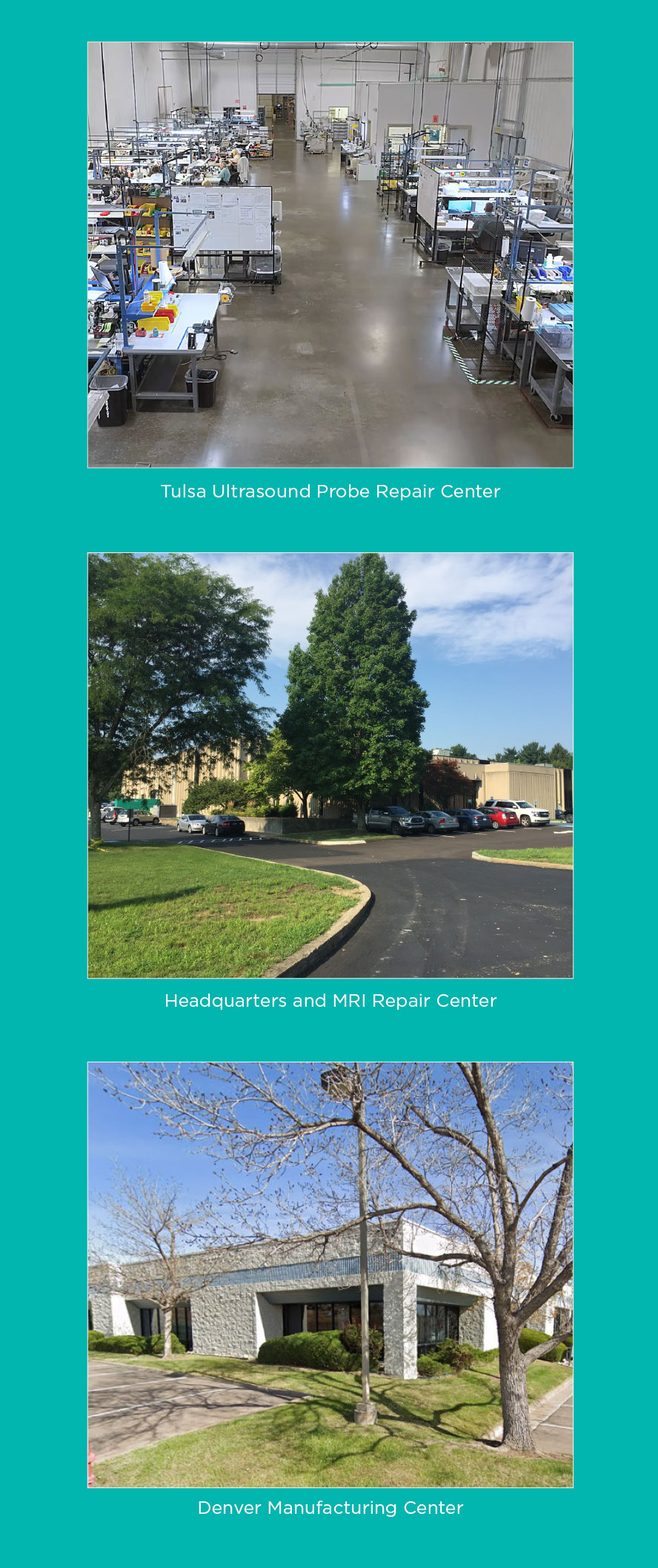 The company’s capstone is their Center of Excellence for Design and Manufacturing. The FDA-registered facility is a contract manufacturer of ultrasound probes and ultrasound related devices for several very prominent OEMs. The facility’s cGMP’s (Current Good Manufacturing Practices), engineering expertise, and acoustic testing lab assist to develop, verify and validate repair processes and materials for the Tulsa Ultrasound Repair Center of Excellence.